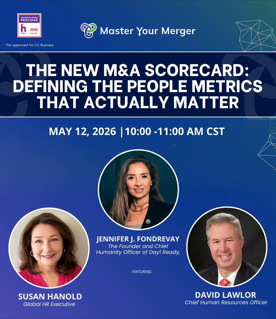 Join us for this month’s HR M&A Roundtable, as we will take the next step together. Using the four categories highlighted in Forbes as our starting point, we will explore what a practical, practitioner-built people scorecard could be. We will look at the signals that actually tell us whether an integration is creating value or slowly accumulating risk. And we will do it in a way that reflects how work gets done in real deals, not in theory.